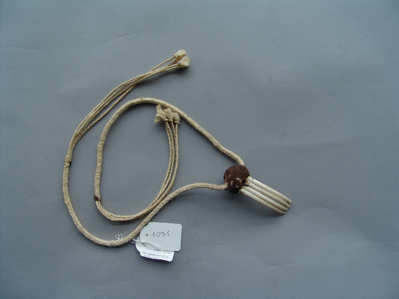 - NOTIZIE STORICO CRITICHE oggetto prodotto all'interno di un gruppo di etnia Xavante risiedente nello stato di Goias in Brasile come appare nella documentazione di accompagnamento alla collezione.\nFatto dagli uomini con cotone filato dalle donne, è il secondo dei tre ornamenti che il padrino colloca al collo della ragazza che si sta per sposare. Fa parte di una triade di collane che la ragazza riceve per il matrimonio (v. PAM 1032 e 1041).