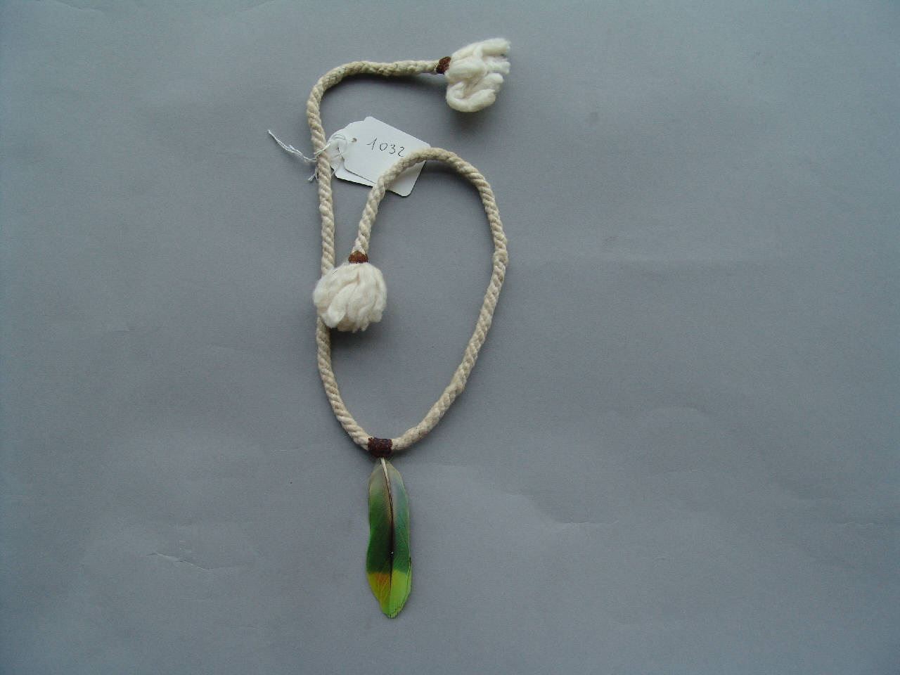 - NOTIZIE STORICO CRITICHE oggetto prodotto all'interno di un gruppo di etnia Xavante risiedente nello stato di Goias in Brasile come appare nella documentazione di accompagnamento alla collezione.\nFatto dagli uomini in cotone filato dalle donne, questo ornamento viene messo al collo dal padrino della ragazza che sta per sposarsi. E' il terzo ornamento della triade di collane che una ragazza riceve per il matrimonio (v. PAM 1031 e 1041). Si usa con la penna sulla nuca e legato sul davanti. Alla fine di questa cerimonia, che avviene all'interno della casa, la ragazza esce e si inginocchia su una stuoia dove le sue amiche le tolgono gli ornamenti e li conservano come ricordo.
