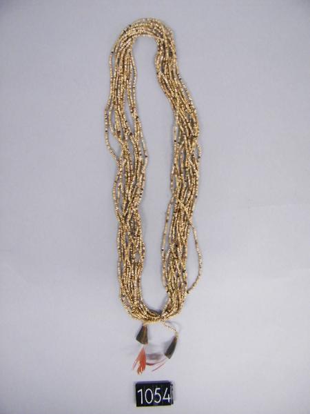 Collana di semi e piume a dodici giri con pendente. Su tutta la lunghezza sono infilati semi marrone chiaro molto piccoli. Il pendente è formato da due fili, su ciascuno dei quali ci sono quindici semi marroni, come quelli dei giri e una unghia di conghiale, da cui esce una piuma rossa.