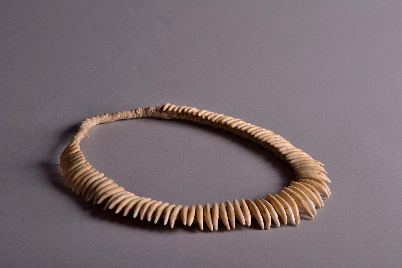 Collana di semi e cotone a un giro. Su tutta la lunghezza, tranne dieci centimetri per l'allacciatura posteriore, sono infilati denti forati.