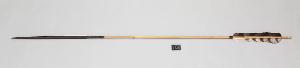 Freccia con asta di bambù, punta in legno lunga e stretta e paletta con una penna bianca striata di nero.