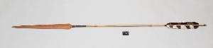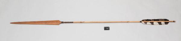 Freccia con asta di bambù, punta in bambù piatta e paletta con una penna bianca striata di nero.