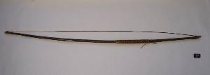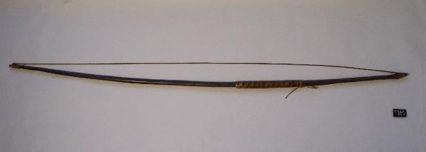 Arco in legno con corda in fibra vegetale, con una seconda corda attorcigliata all'arco.