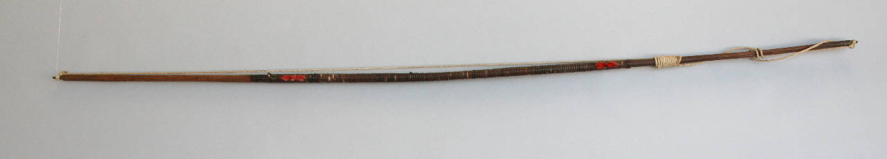 Arco in legno con corda in fibra vegetale. Il legno é rivestito con strisce in fibra vegetale in quattro punti delle quali sono fissate delle piumette rosse. Sul legno è avvolta anche una seconda corda.