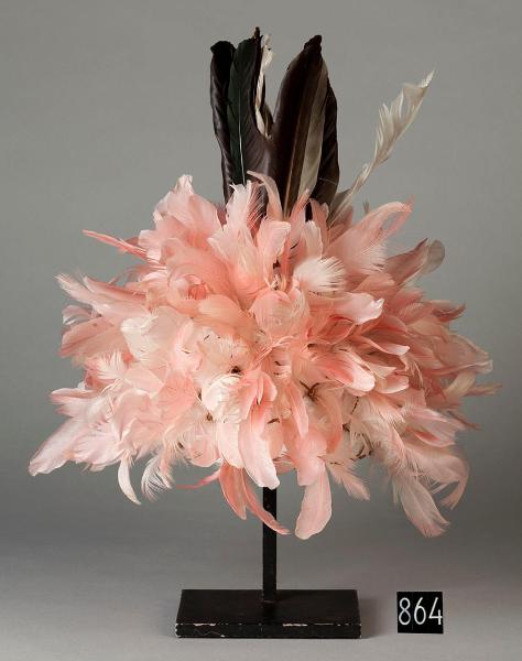 Ornamento per il capo realizzato con un supporto di fibre intrecciate a formare una rete su cui sono infisse verticalmente delle penne di color rosa.