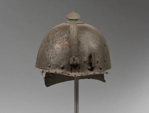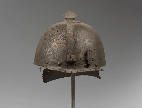Elmo da uomo d'arme a casco con visiera e calotta. Al sommo, piastra di rinforzo con chiodo.
