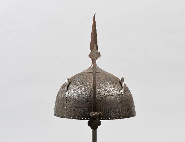 Elmo persiano da uomo d'arme a casco in un sol pezzo, in ferro, con orlo inferiore decorato a bulino a motivi geometrici e figure con turbante. L'elmo è dotato di nasale mobile con due pennacchiere laterali.