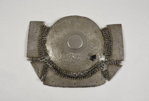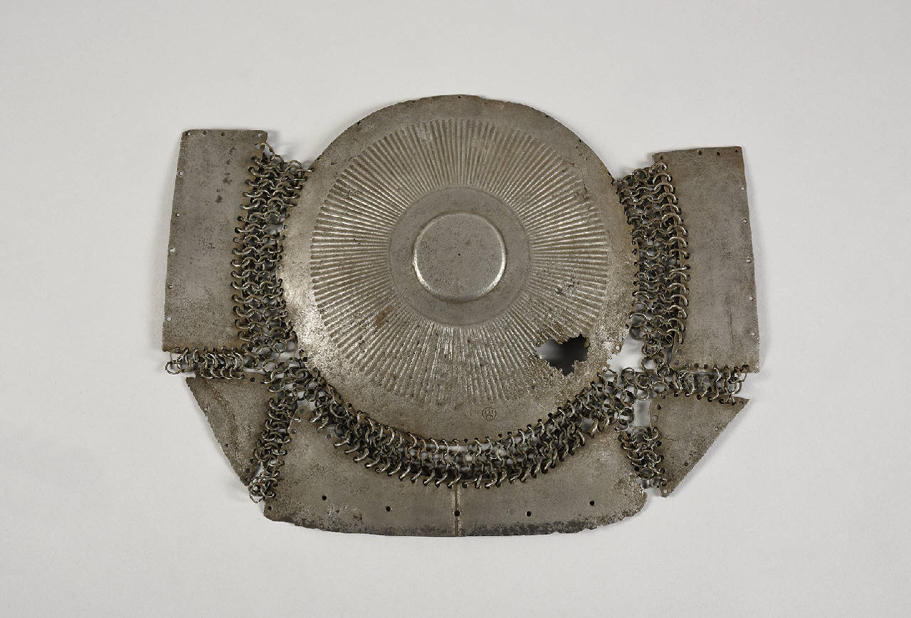 Petto di corazza costituito da piastra circolare raggiante a sbalzo legato mediante maglia con cinque piastre. Marca di fabbrica: asta con mezzaluna.