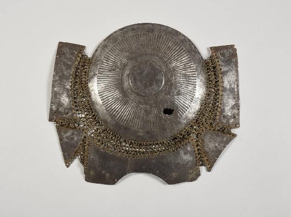 Petto di corazza costituito da specchio centrale liscio con decorazione geometrica a bulino e umboncino centrale. È dotato di due cinghie di cuoio. Marca di fabbrica: asta con mezzaluna.