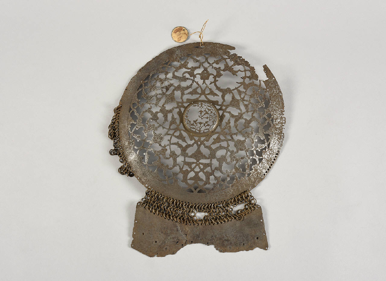 Petto (?) di corazza brunita costituito da umbone centrale largo decorato a giorno con intreccio floreale e incisioni a rabesco. Anelli a grani d'orzo. Marca di fabbrica: asta con mezzaluna.