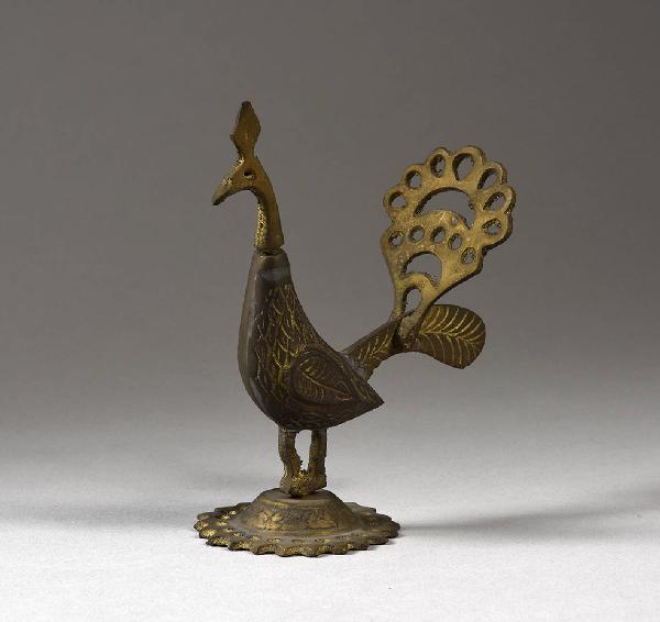 Pavone in metallo poggiante su base rotonda dentellata coda alzata