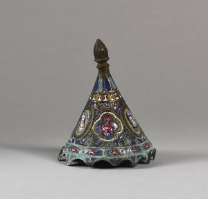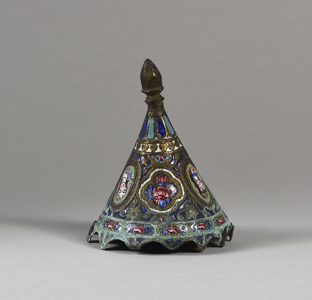 Parte di oggetto non identificato di forma conica con smaltatura policroma e ritratti femminili su più lati. Tipica produzione del periodo Qajar (XIX secolo) dell'arte persiana.