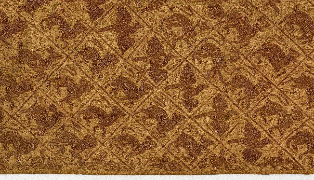 Coperta nuziale rettangolare a doppio strato. Il fronte presenta ricami a punto catenella con dettagli a punto filza che disegna un partito compositivo a quadrangolo che si ripetono su tutta la superficie. La lettura dei pannelli avviene lungo la verticale (ma non vi è una sola direzione di lettura). \nCiascuna cella comprende decorazioni con animali (tra cui la colomba, animale proprio di diverse tradizioni, da quella cristiana a quelle del Vicino Oriente), fermi o in movimento, creature ibride, umani. La presenza di animali e cacciatori rimanda alle narrazioni del Bene contrapposto al Male e del Sé contrapposto all'Altro. Tra le figure umane compare anche una donna con rametti tra le mani, simbolo della Dea Madre (nella versione induista di Lakshimi, consorte di Vishnu), sospesa su di un fiore di loto.