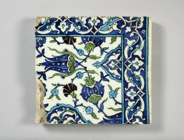 Mattonella quadrangolare, angolo di un pannello, dipinta in blu, turchese, verde su fondo bianco sotto un'invetriatura trasparente. La decorazione consiste in un bordo con disegni di arabeschi e gigli stilizzati separato mediante una striscia turchese dal resto della mattonella. La rimanente porzione presenta eleganti tulipani, garofani e tralci floreali.\nSi osservano anche porzioni di medaglioni ovali polilobati con arabeschi.