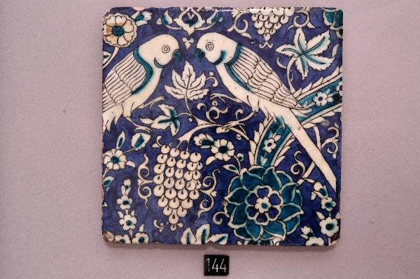 Mattonella quadrata decorata in blu, verde e bianco sotto invetriatura trasparente. La decorazione è costituita da due pappagalli affrontati e dalla porzione di un medaglione definito da un nastro dal profilo seghettato e abitato da piccoli fiori a risparmio. Tutta la superficie è decorata da grosse rosette dai petali aperti, da sinuosi ramoscelli fioriti, grappoli d'uva e foglie di vite. Per un certo periodo la mattonella in esame è stata parte di un pannello con le mattonelle inv. ISL 143 e ISL 145. La mattonella in esame ha una decorazione pressoché identica a quelle con inv. ISL 130 e ISL 131.