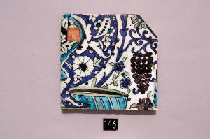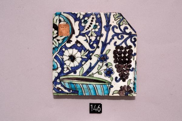 Mattonella quadrata decorata in blu, turchese, verde chiaro, bruno melanzana e bianco sotto invetriatura trasparente. La decorazione consiste nella porzione di un vaso decorato con fioriture carnose, foglie e arabeschi. Alla base del vaso è posta una vaschetta. A fianco del vaso sono presenti tralci vegetali fioriti e un grappolo d'uva. Per un certo periodo la mattonella in esame è stata parte di un pannello con le mattonelle inv. ISL 147, ISL 148 e ISL 149 con le quali completava il disegno.
