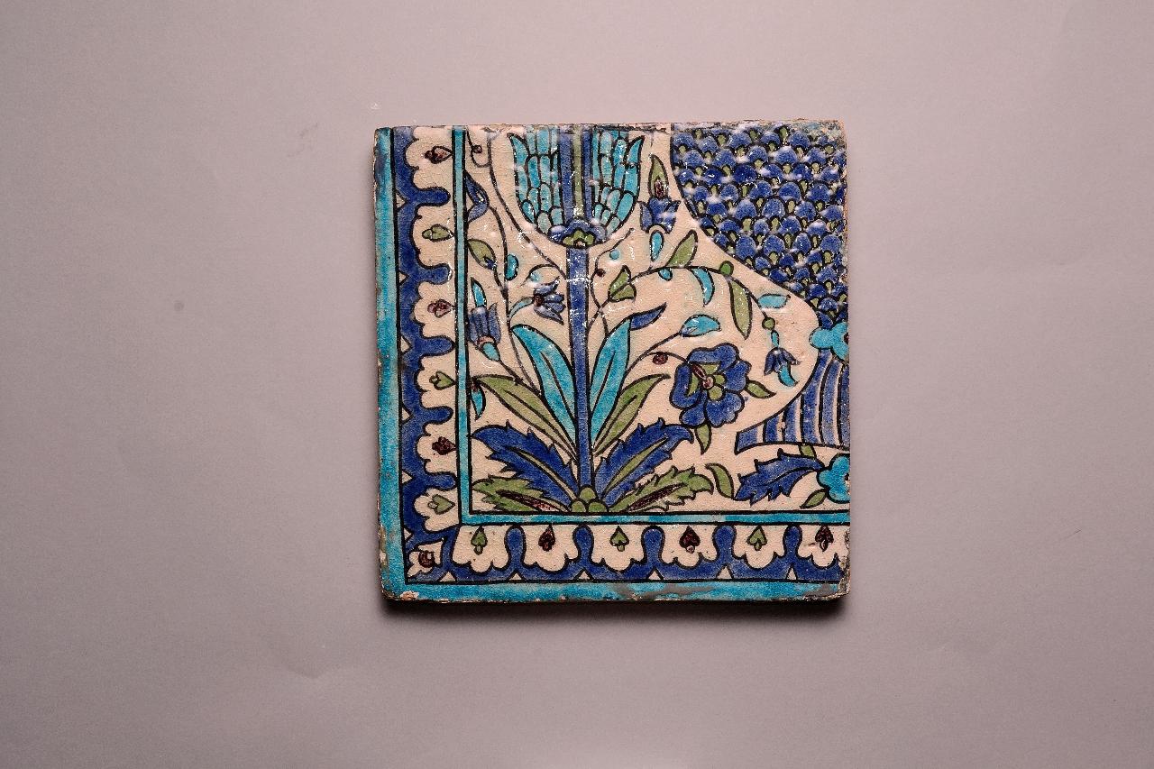 Mattonella quadrata, angolo di un pannello, decorata in blu, turchese, verde chiaro e bianco sotto invetriatura trasparente. La decorazione consiste nella porzione di un vaso affiancato da un cipresso. Il bordo è abitato da palmette. \nPer un certo periodo la mattonella in esame è stata parte di un pannello con le mattonelle inv. ISL 150, ISL 152, ISL 153, ISL 154, ISL 155, ISL 156, ISL 157 con le quali completava il disegno.