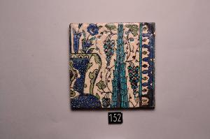 Mattonella quadrata decorata in blu, turchese, verde chiaro e bianco sotto invetriatura trasparente. La decorazione consiste nella porzione di un vaso, dalla cui bocca escono rami fioriti e fogliati, affiancato dalla parte superiore di cipresso. Lo sfondo è abitato da grappoli d'uva e fiori. Su un lato bordura a palmette. \nPer un certo periodo la mattonella in esame è stata parte di un pannello con le mattonelle inv. ISL 150, ISL 151, ISL 153, ISL 154, ISL 155, ISL 156, ISL 157 con le quali completava il disegno.