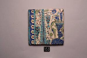Mattonella quadrata decorata in blu, turchese, verde chiaro e bianco sotto invetriatura trasparente. La decorazione consiste nella porzione di un vaso, dalla cui bocca escono rami fioriti e fogliati, affiancato dalla parte superiore di cipresso. Lo sfondo è abitato da grappoli d'uva, e fiori. Su un lato bordura a palmette. \nPer un certo periodo la mattonella in esame è stata parte di un pannello con le mattonelle inv. ISL 150, ISL 151, ISL 152, ISL 154, ISL 155, ISL 156, ISL 157 con le quali completava il disegno.