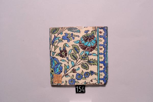 Mattonella quadrata decorata in blu, turchese, verde chiaro, malva scuro e bianco sotto invetriatura trasparente. La decorazione consiste in tralci fioriti, rametti di gigli, rosette, palmette e foglie di varie forme. \nSu un lato fregio continuo a palmette entro un sottile bordo turchese. \nPer un certo periodo la mattonella in esame è stata parte di un pannello con le mattonelle inv. ISL 150, ISL 151, ISL 152, ISL 153, ISL 155, ISL 156, ISL 157 con le quali completava il disegno.