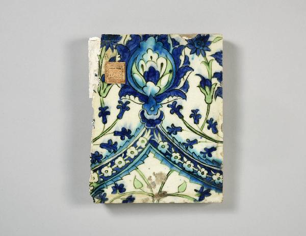 Mattonella quadrangolare dipinta in blu, turchese, verde salvia su fondo bianco sotto un'invetriatura trasparente. La decorazione consiste nella porzione di un medaglione ovale dal profilo seghettato definito mediante una fascia abitata da minuti fiorellini e culminante con una carnosa palmetta. Il resto della superficie e ornato da sottili steli ingentiliti da piccoli gigli blu e da porzioni di palmette. Per la decorazione il presente manufatto può essere messo in relazione con la mattonella n. ISL 166 con la quale ha fatto parte di un unico pannello decorativo, poi smembrato.\nSul mercato antiquariale internazionale sono spesso presenti mattonelle con decorazione pressoché uguale.