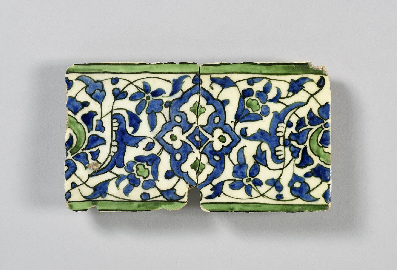 Mattonella rettangolare sicuramente facente parte del fregio di un pannello. La decorazione consiste in un cartiglio polilobato con quattro gigli stilizzati circondato da forme floreali e arabeschi. I due lati lunghi sono profilati da una sottile fascia verde salvia. I colori (blu, bianco, verde, nero) sono tipici delle mattonelle prodotte a Damasco tra la fine del XVI secolo e l'inizio del successivo. \nLa decorazione della mattonella può essere messa in relazione con quella della cinquecentesca ceramica siriana dipinta in nero sotto invetriatura azzurra conservata al Museo Nazionale del Bargello di Firenze (inv. Carrand 1978).\nLa presente mattonella è entrata a far parte delle collezioni museali come proveniente dall'Anatolia. La datazione a cavallo tra XVI e XVII secolo è convincente.