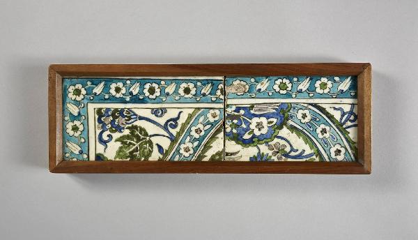 Mattonella rettangolare dipinta in verde, blu cobalto, turchese e bianco sotto un'invetriatura trasparente. La decorazione consiste in un bordo decorato da un tralcio di rosette e tulipani. La decorazione della superficie centrale della mattonella consiste in rametti fioriti, in un nastro sinuoso abitato da minute corolle, rametti fioriti e una foglia dal profilo seghettato e nella porzione di un medaglione polilobato entro il quale trovano posto un tulipano e altre inflorescenze. \nCollocata in una cornice di legno con la mattonella inv. n. ISL 121.