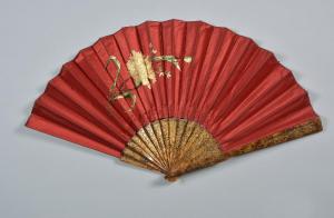 Ventaglio brisé con quattordici stecche imitanti la radica pirografate in oro. Pagina di raso rosso con un fiore di peonia ricamato in seta policroma e canottiglia in oro.