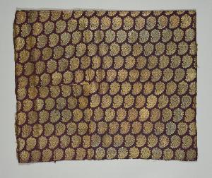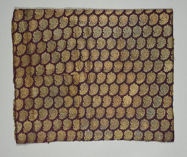 - NOTIZIE STORICO CRITICHE Una prima catalogazione del reperto del MUDEC attribuisce il frammento in questione, probabilmente proveniente da una veste, a manifattura italiana seicentesca. L'impaginato e il fondo viola possono in effetti ricordare certe impostazioni della produzione tessile della penisola del XVII secolo basate sulla ripetizione di un singolo elemento curvilineo e sull'introduzione di quel nuovo colore nella gamma cromatica dei tessuti; la stessa foglia boteh è rintracciabile come motivo del disegno in svariati manufatti italiani del Seicento. Si ritiene tuttavia che il reperto in analisi sia di produzione orientale, dove ha avuto origine l'ornamento chiamato cachemire, sfruttato anche in tessuti per abbigliamento dall'impaginato simili al reperto a Milano, come dimostra una stoffa persiana safavide del Cleveland Museum of Art della seconda metà del XVII secolo i cui personaggi indossano una sopravveste a palmette isolate ripetute (The Cleveland Museum of Art, a.n. 1949.467, pubblicato in L.W. Mackie, 2015, p. 387). Pertanto si reputa che il frammento del MUDEC debba ascriversi all'India e datarsi al XIX secolo, quando la mandorla ricurva - alla cui storia hanno contribuito sia l'India che la Persia, entrambe accomunate dalla cultura artistica dell'Islam - si attestò in una formula semplificata rispetto all'articolazione dei tessuti serici seicenteschi ben esemplificata da un frammento del Detroit Insitute of Art (a.n. 42.3), attribuibile all'India (A. Coulin Weibel, 1972, p. 122, n. 143 e relativa tavola). A suggerire l'ipotesi indiana intervengono anche le recenti considerazioni di Louise Mackie che, riassumento studi comparativi precedenti basati sull'analisi dei filati metallici e il layout dei motivi decorativi, ha cercato di fare chiarezza sugli inevitabili dubbi che concernono due produzioni artisticamente simili come la moghol e la safavide. Secondo la curatrice del Dipartimento di tessili e arte islamica del Cleveland Institute of Art i fili metallici con avvolgimento della lamina in direzione Z su anima di seta gialla e la unidirezionalità dei motivi sarebbero peculiari dell'India (L.W. Macke, 2015, p. 426).