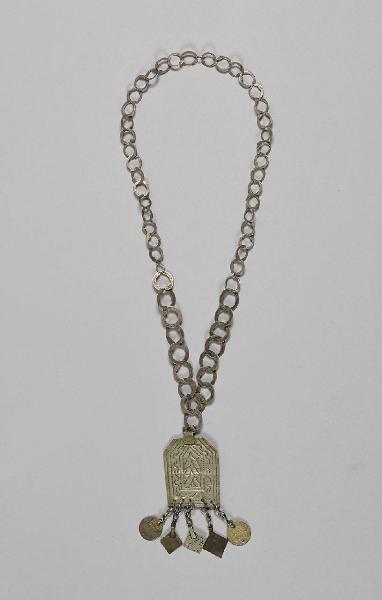Catena ornamentale a maglie circolari appiattite con medaglione pentagonale al quale sono appesi 5 pendenti (3 quadrati, 2 rotondi). Sui pendenti compaiono caratteri arabi
