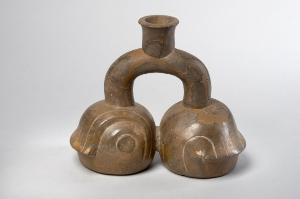Vaso a due corpi a forma di conchiglie in terracotta, con ansa a staffa