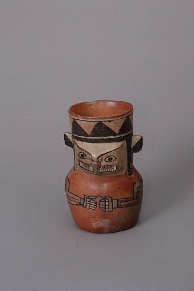 Vaso antropozoomorfo in terracotta dipinta con pipistrello umanizzato. Si notino gli arti scheletrici e le orecchie appuntite.