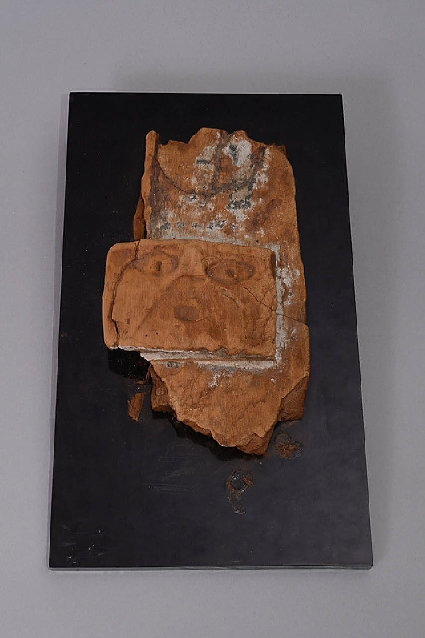 Frammento in legno policromo scolpito con una figura antropomorfa