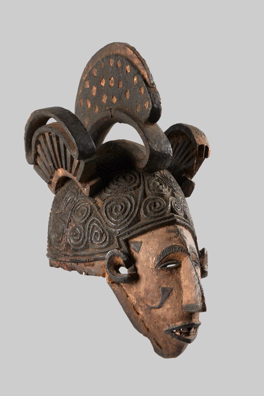 Maschera-casco rappresentante una figura femminile dall'elaborata acconciatura realizzata da doppie spirali in rilievo. Sul volto sono visibili pochi resti di caolino che contrastano con il colore più scuro delle sopracciglia e delle scarificazioni.