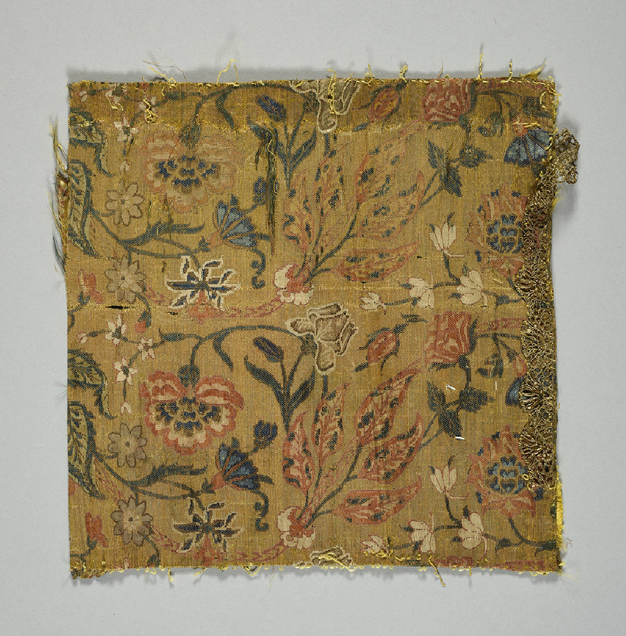 frammento quadrato con bordi ripiegati e applicazioni di trina di metallo, tracce di fodera di taffetas di seta giallo.\nDisegno a tralci vegetali sinuosi che intervallano fiori tra i quali: iris, rose, ranuncoli/peonie, fritillaria, giacinti, gelsomini, campanule.