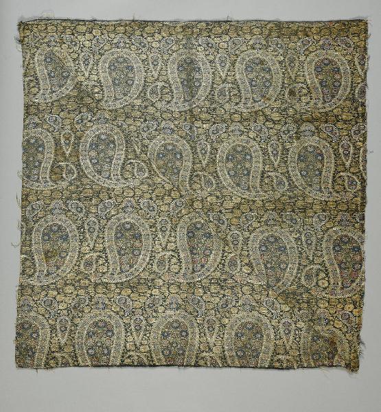 - NOTIZIE STORICO CRITICHE il rametto fiorito ondulante, particolarmente usato nella decorazione sviluppatasi in Medio Oriente e in India a partire dal XVII secolo, alla fine del Settecento si tramuta nella forma a mandorla ricurva destinata a diventare un classico dell'ornamento tessile in Iran, India e Europa occidentale. L'accentuazione della silhouette si accompagna, nel corso della prima metà dell'Ottocento, a una sorta di horror vacui di cui la stoffa in esamina è testimonianza diretta insieme agli scialli che pure sono allineati su questa nuova tendenza. La referenza milanese è uguale nel disegno e nei colori al riquadro di stoffa per abbigliamento del Chicago Institute of Art (reference number n. 1932.242) attribuito all'Iran e datato alla prima metà del XIX secolo, ai tempi del dominio Qajar (1786-1925) in Iran. La pittura ufficiale Qajar dell'Ottocento, fortemente influenzata da modelli europei, costituisce in effetti una fonte preziosa per verificare l'evoluzione dell'approccio al disegno cachemire e l'utilizzo di pattern simili a quello in esame nell'abbigliamento formale della corte (si veda ad esempio il ritratto al Musée du Louvre del Principe Ardashir Mirza, governatore di Teheran che indossa un caftano di un tessuto simile a quello in analisi , pubblicato in Islam. Arte e architettura, 2000, p. 529).
