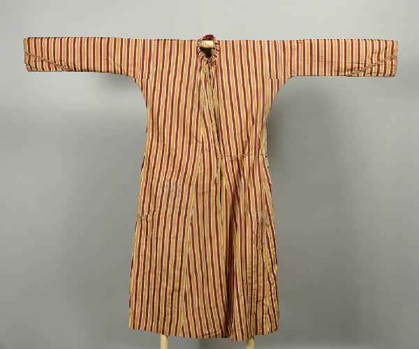 veste (caftano) foderata parzialmente. A forma di T, costituita da più teli tagliati in drittofilo cuciti insieme e svasati dal collo verso i piedi, scollo con colletto rialzato. Sono presenti tasche a filo. Nel tratto finale la cucitura delle maniche è aperta e i due lembi sono profilati da un bordo a treccia a due colori. Un sistema di abbottonatura (bottoni sferici e asole) riduce la dimensione delle maniche nel tratto finale. La stessa chiusura a bottoni sferici con asole si trova nel colletto. La veste ha spachci laterali, decorati dagli stessi bordi a treccia che corrono lungo le aperture delle maniche e della parte anteriore destra del caftano. La chiusura del caftano è a portafoglio grazie a due lacci, uno dei quali è l'eccedenza in lunghezza della profilatura della parte anteriore in sovrapposizione. L'interno della veste è rinforzato ai bordi da un alto profilo - sagomato a cuneo agli angoli delle due parti frontali - di tela rosso carminio tagliata in sbiego. La veste è parzialmente foderata con una tela avorio.