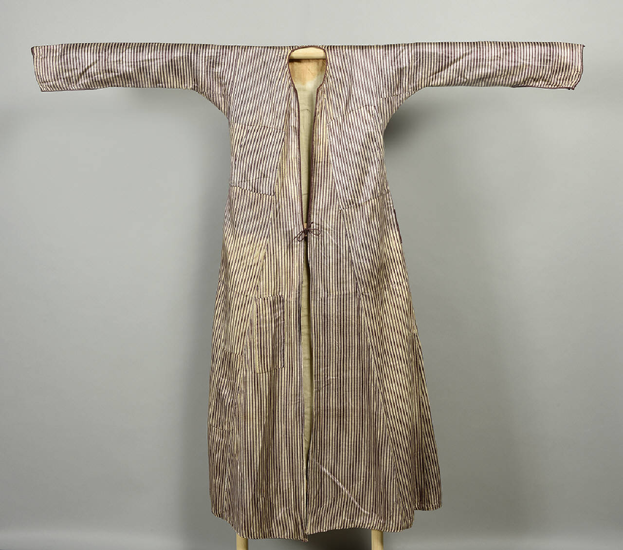 veste (caftano) foderata parzialmente. A forma di T, costituità da più teli tagliati in drittofilo cuciti insieme - e inseriti rettangolari di stoffa - svasati dal collo verso i piedi, scollo poco profondo privo di colletto. Sono presenti tasche a filo. Le maniche e la veste si caratterizzano per spachci decorati da bordi a treccia che corrono anche lungo lo scollo e a profilare la porzione anteriore destra del caftano fin sotto la vita, dove l'eccedenza in lunghezza del bordo si collega a un ulteriore laccio che garantisce la chiusura a portafoglio. I bordi all'interno della veste sono rinforzati da un alto profilo di tela cangiante violacea (ordito rosso carminio, trama blu) e vinaccia cucite a sbiego. E' presente un ulteriore rinforzo di feltro dallo scollo alla chisurua in vita. La veste è parzialmente foderata con una tela avorio e rimane traccia di un lacico per la chiusura interna.