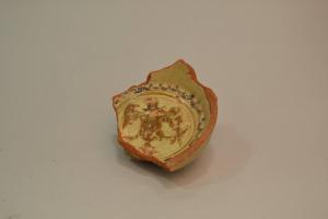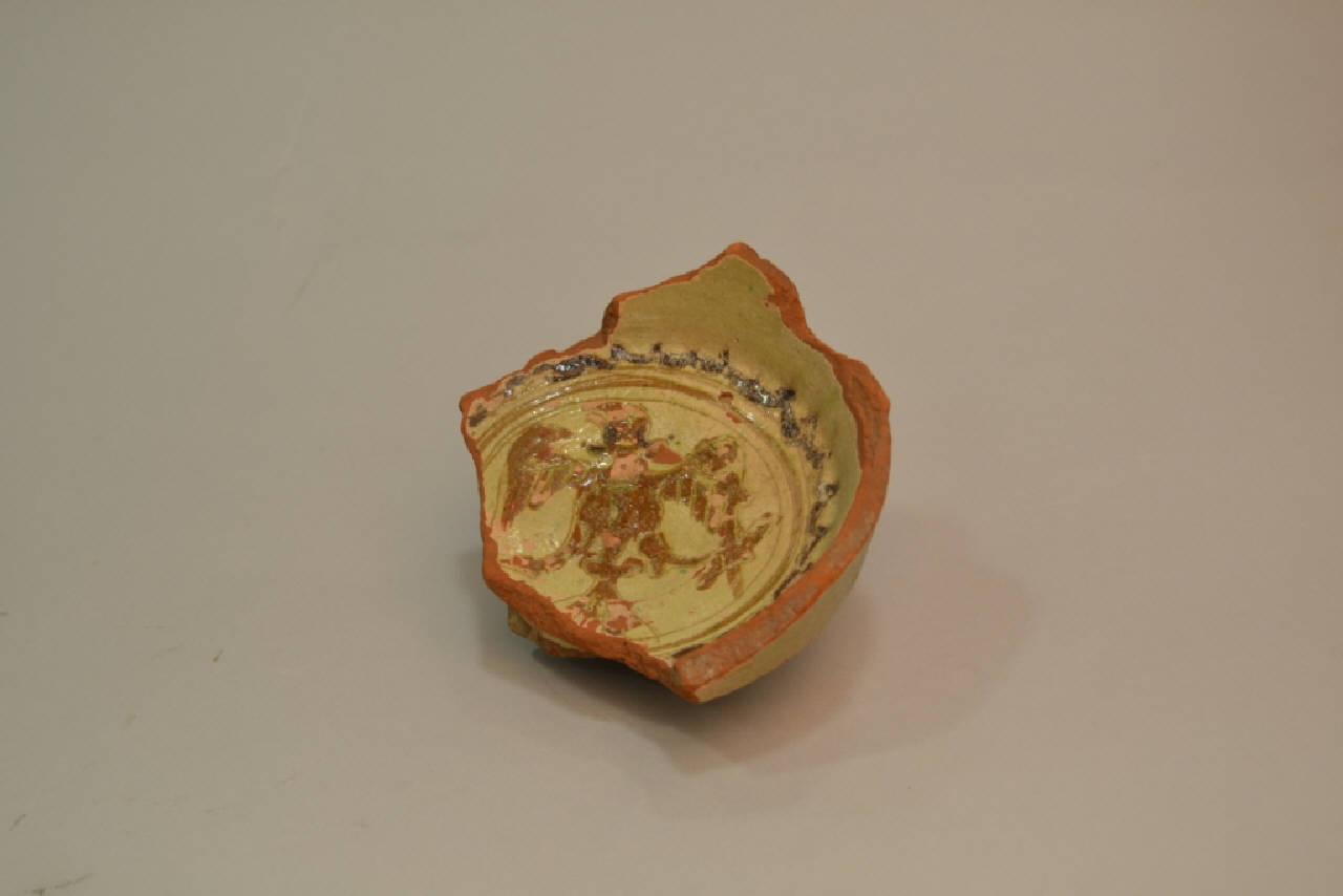 Frammento (fondo e parte della parete) di recipiente in ceramica graffita e invetriata. All'interno del fondo compare un'aquila ad ali spiegate all'interno cerchio color ocra bruono. Più all'esterno comparte anche un cerchio coronato. La vetrina dell'intero manufatto è di color giallo, mentre lo spesso impasto ceramico è di color rosso acceso
