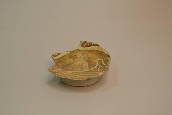 frammento di recipiente (fondo) in ceramica a lustro metallico. Le decorazione sono costituite da motivi dipinti in color ocra chiara su fondo bianco