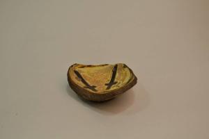 Frammento (fondo) di recipiente in ceramica graffita e invetriata. All'interno del fondo compare uno stemma nobiliare costituito da due spade affrontate separate da una coppa all'interno cerchio color ocra bruono. La vetrina dell'intero manufatto è di color giallo chiaro , mentre lo spesso impasto ceramico è di color rosso acceso.