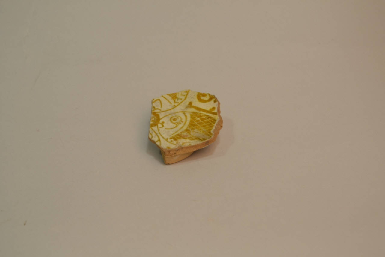 frammento di recipiente (fondo) in ceramica a lustro metallico. Le decorazione è costituita da motivi costituiti da pesci dipinti in color ocra chiara su fondo bianco. L'impasto è rosa chiaro.