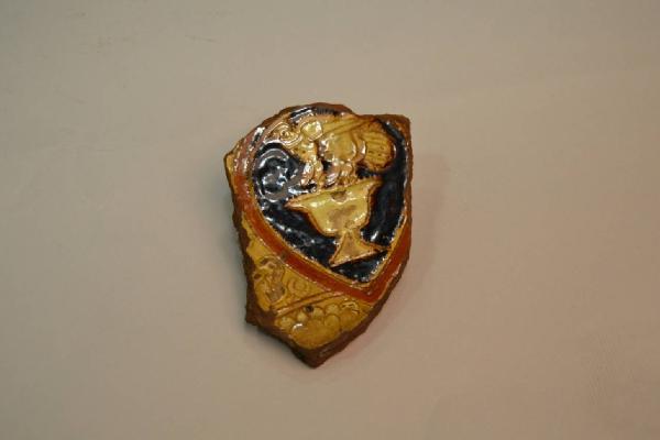 Frammento (parete) di recipiente in ceramica graffita e invetriata. All'interno di uno scudo con sfondo bruno compare una coppa al cui interno si sta posando un volatile. La vetrina dell'intero manufatto è di color giallo , mentre lo spesso impasto ceramico è di color rosso acceso.