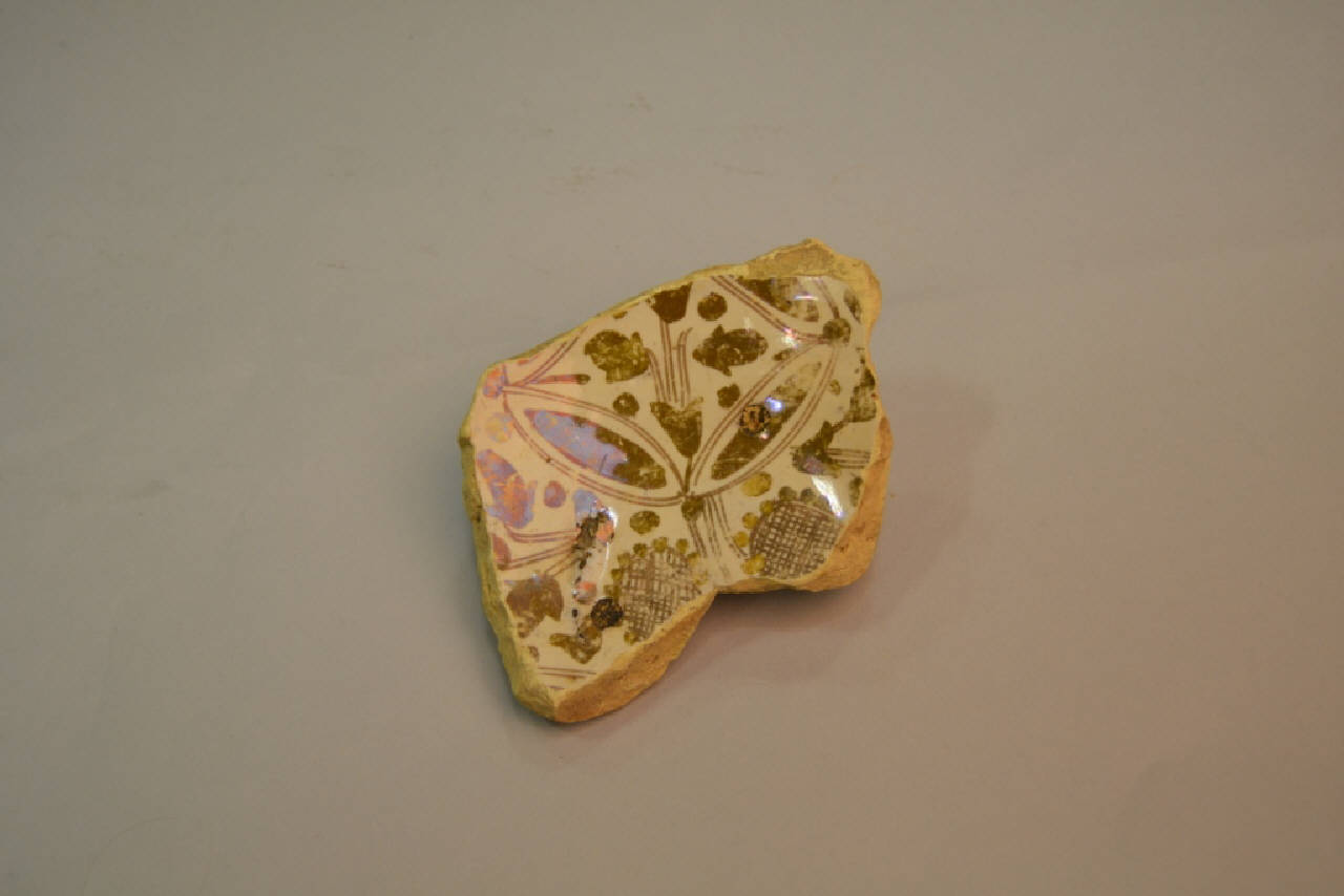 frammento di recipiente (fondo) in ceramica a lustro metallico. Le decorazione è costituita da motivi fitomorfi dipinti in color ocra chiara su fondo bianco