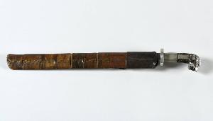 Impugnatura e pomo d'un solo pezzo. Il pomo è intagliato a testa di chimera. Occhi e naso in alluminio, come la piccola calotta circolare con chiodo metallico al centro, che copre la testa e dalla quale scendono posteriormente nove linguette che terminano sul collo fissate con chiodi. Alluminio è usato per sopracciglia, canini, mento e una fila di sei tondini posti sulla nuca, separati nel mezzo da una striscia che congiunge il disco superiore al resto dell'impugnatura. Sotto la testa, l'impugnatura ottagonale ,con due lati più stretti in corrispondenza del filo e del dorso, scolpita a fiori su quattro facce, alternate ad altrettante d'alluminio. La metà vicino alla lama è completamente avvolta da una lamina di alluminio. L'impugnatura termina in un guardiamano discoidale in legno avvolto al perimetro da un anello d'alluminio. Lama, pesante, ondulata nel dorso, si stringe al tallone si allarga fino a metà del debole, si ristringe in punta . Fodero in legno ricoperto di pelle.
