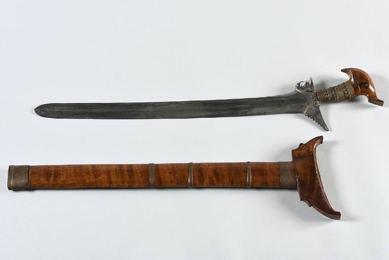 - NOTIZIE STORICO CRITICHE Facendo un raffronto con altri kalis filippini, si rileva un'impugnatura comune a quelle dell'etnia Tausug (arcipelago di Sulu) e una lama nello stile Maguidanao (sud dell'isola Mindanao). La presenza di due denti asang-asang / baca-baca in argento impreziosiscono l'arma. La mancanza della fascia katik / gangya / sampir, e la linea incisa sul tallone che vi allude, sono caratteristiche dell'inizio del XX secolo.Il fodero è originale. Il legno di cui è fatto potrebbe essere il kemuning (murraya paniculata) malaysiano, ma spesso erano usati anche banati, il teak, il timoho o il pelet.