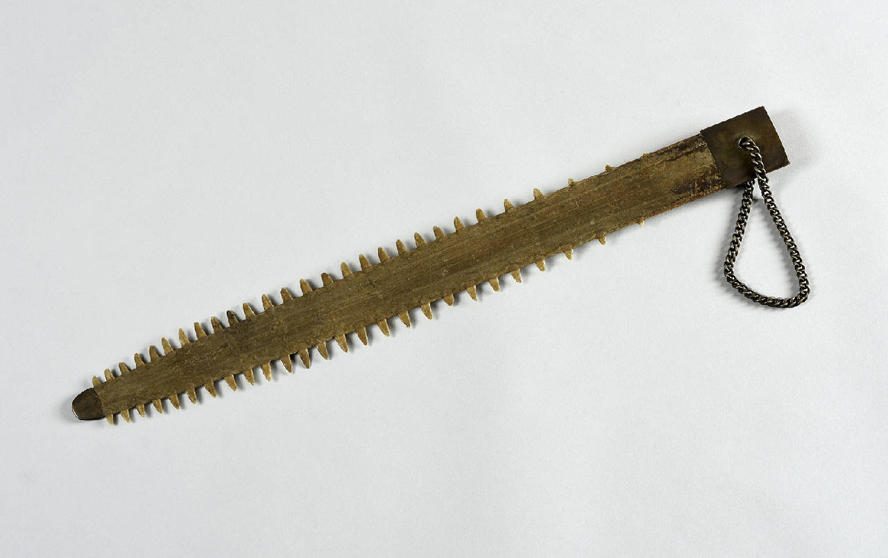 - NOTIZIE STORICO CRITICHE Armi simboliche come queste si ritrovano nelle isole del pacifico. Il rostro del pescesega era trasformato in arma nelle Filippine, in Papua Nuova Guinea e in Nuova Zelanda. Talvolta, i Samales, il ceppo indonesiano più antico dell'arcipelago di Sulu, rifacevano completamente in metallo la lama del pesce sega e la fornivano dello stesso calciolo con catenella qui utilizzato (Vianello). Al Museo Pigorini di Roma è esposto un esemplare molto più lungo, delle Isole Gilbert della Micronesia. Ancora, è possibile vedere un oggetto come questo nella foto della copertina interna dell'opera di Holstein, dove appare appeso a un muro assieme a una moltitudine di altre armi etnografiche (principalmente di provenienza africana); nell'opera, però, l'oggetto non è trattato.\nRiferimenti:\nAA.VV., Museo dell'uomo, usi, costumi, tradizioni di tutti i popoli della Terra, [W.E.L. Italiana] Milano, Fratelli Fabbri Editori, 1964, Vol. 8 p. 51.\nHOLSTEIN, Pierre, Contibutiòn à l'étude des armes orientales, Paris, Les Editions Albert Levy, 1931.\nSPESIER, Dr. Felix, Etnographishe materialen aus den Neuen Hebriden und den Banes Inseln, Berlin, C.W. Kreidel's Uerlag, 1923. Liechtenstein, Kruas Reprint Nendeln, 1979.\nSTONE, George Cameron, A glossary of the construction, decoration and use of arms and armours; in all countries and in all times, New York, Jack Brussell Publisher, Noble offset printers inc., 1961.\nTUCCI, G. (a c.), Armi e armature asiatiche, Busto Arsizio, Bramante, 1974.\nVIANELLO, Gianni, Armi e armature orientali, Milano, Bramante Ed., 1966.\nThe cultural and economic importance of sawfishes (family Pristidae) http://www.flmnh.ufl.edu/