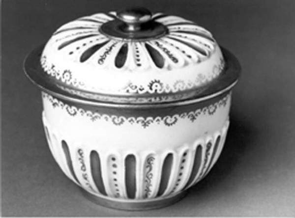 Zuccheriera rotonda su piede dorato ad anello con coperchio a cupolina schiacciata, bordo piatto e presa a pomolo dorati. Decoro plastico a baccellature scanalate sul corpo e sul coperchio dipinte in oro a piccoli punti e a racemi alternati. Profili dorati e fregio sulla superficie esterna di ambedue i pezzi e all'interno del corpo.