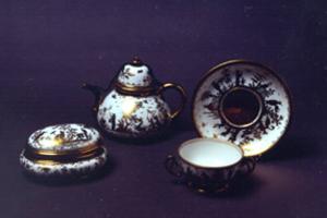 Teiera piriforme con coperchio a cupolina rilevata e presa a pagodina. La presa ad ansa e il beccuccio sono dorati con terminazioni fitoforme la prima, a macherone il secondo, entrambi collegati con il coperchio per mezzo di una catenina in metallo dorato. Il piede ad anello è dipinto in oro con decoro a scagliette, metre i profili del collo e del bordo del coperchio, piatto ed estroflesso, terminano con un decoro "a Merletto".\nIl decoro dipinto, in oro su fondo bianco e su base "Laub und Bandlwerk", propone cineserie tra cui spicca la presenza di un drago.
