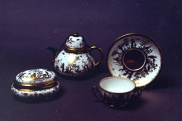 - NOTIZIE STORICO CRITICHE La fattura del decoro dipinto è di altissima qualità; nelle figurine dipinte si palesa l'interpretazione europea di motivi orientali quasi ibridati con la tipologia della Commedia dell'Arte, probabilmente ad opera degli "Hausmalern" di Augsburg.